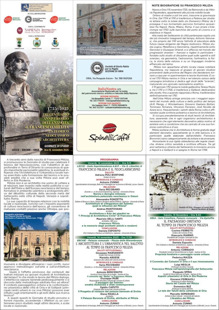 A Trecento anni dalla nascita dell’oritano Francesco Milizia, enigmatico storico e teorico neoclassico dell’architettura, la Soprintendenza Archeologia Belle Arti e Paesaggio per le provincie di Brindisi, Lecce e Taranto, in collaborazione con le sezioni territoriali Messapia e SudSalento di Italia Nostra APS e con la Società di storia patria per la Puglia, sezione di Oria, con il patrocinio dei Comuni di Lecce, Erchie e Oria, con la partecipazione del DiSDRA (Dipartimento di Storia, Rilievo e Restauro dell’Architettura) Facoltà di Architettura, ‘Sapienza’ Università di Roma, ha ritenuto opportuno promuovere le giornate di studio dal titolo: 1725 – 2025. Trecentesimo anniversario della nascita di Francesco Milizia. Un teorico neoclassico dell’Architettura, nelle città di Lecce, Erchie e Oria, nei giorni 14 e 15 novembre 2025.